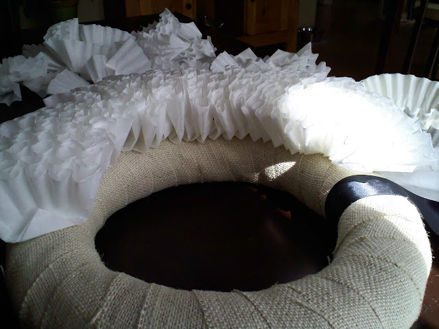 I decided to wrap the burlap fabric over my wreath and then hot glue the folded coffee filters. You can practice folding the filters in different ways to get different looks. This project was under $10.00 and took a few hours (The Nester spent about an hour on the project).