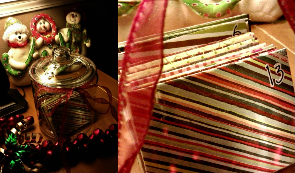 Earlier tonight I showed you some Christmas decor around our home and I came across this jar which holds our Advent Calendar DIY envelopes I made for hubby and I our first married Christmas (2009).