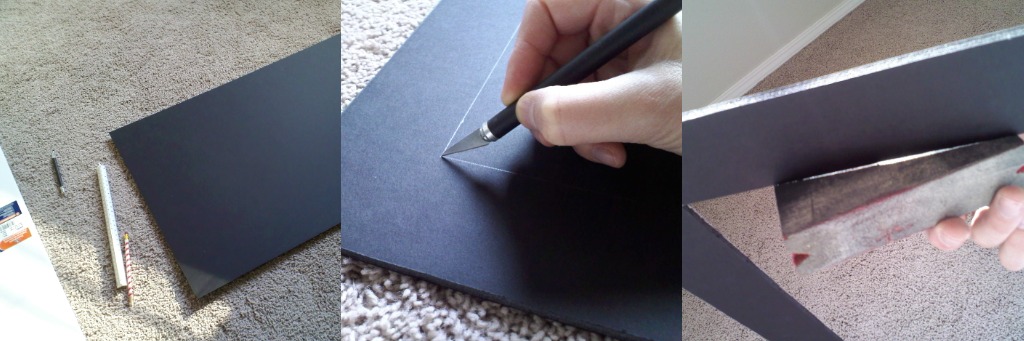 Actually, I searched and searched for a funky frame but didn't want to pay an arm and a leg and thus came up empty handed. Then I thought I could probably make something myself. So, I took a drive to Joanne Fabrics and purchased a black 20 x 30 x 3/16in foam board. I think it cost me a whopping $5.00. It was pretty simple really, I just took a ruler and measured out a 2 inch outline around the board. Then I used my exact-o knife and cut it out. Knowing that I'd have people holding the frame, I sanded the edges so they were a little softer for holding.