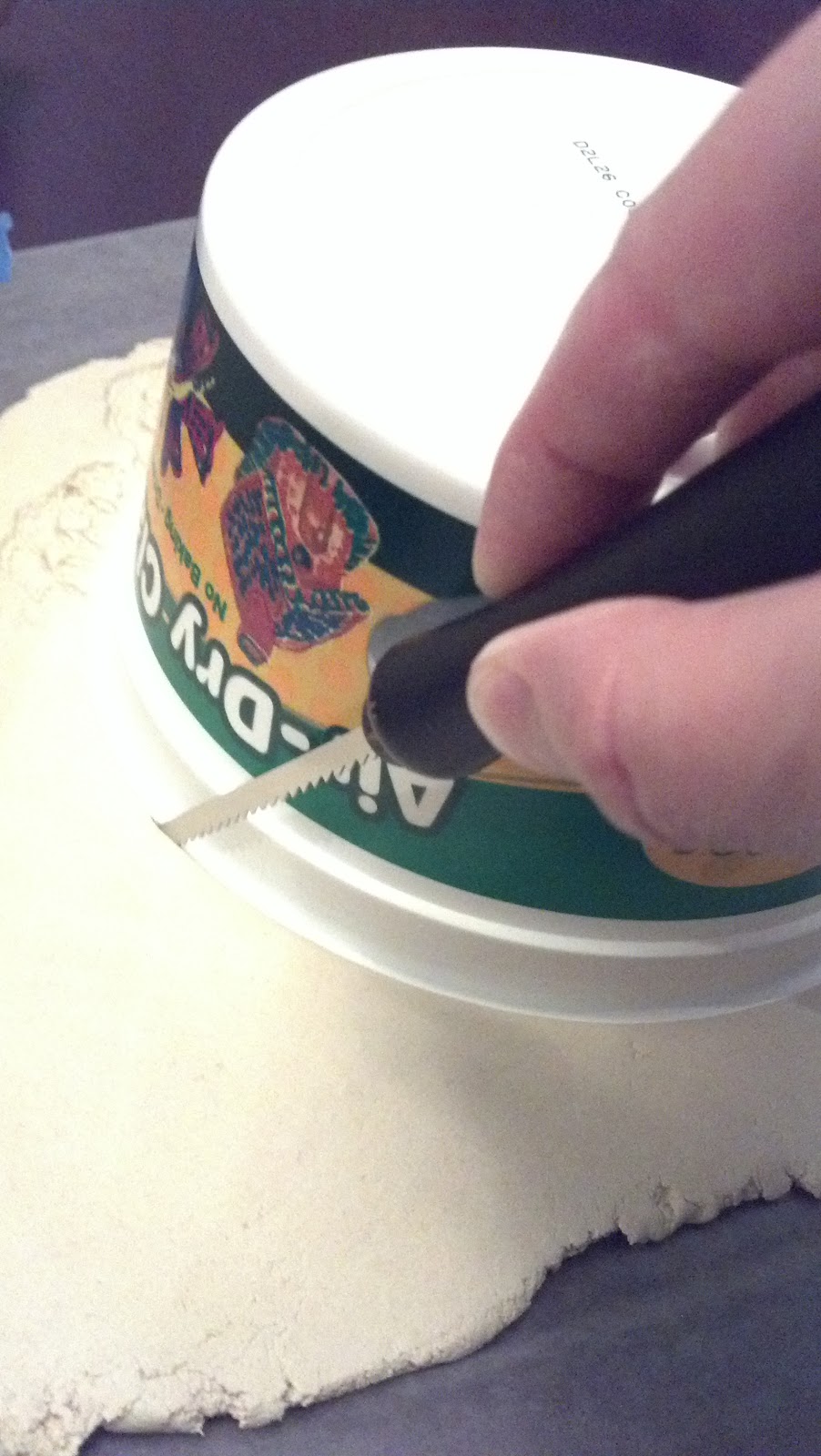Using your glass dish or Tupperware container, place over the clay. Take your knife or tool and trim away any extra remaining clay.