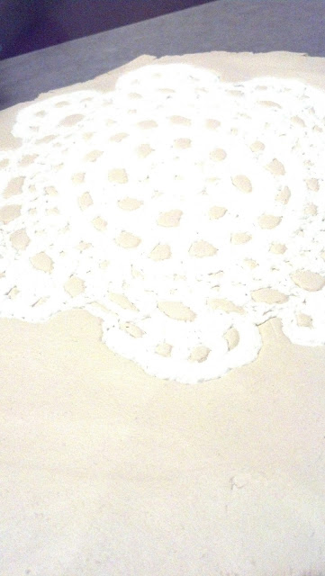 Place your lace or fabric doily onto the clay and then using your rolling pin make an imprint onto the clay. If you really want to make a deep impression then roll until your clay is flat with the top of the doily.