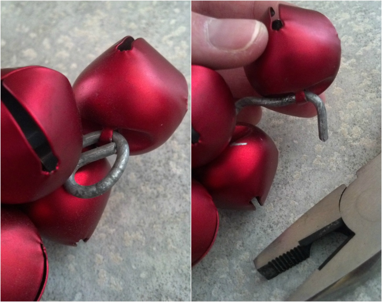 Next I used some pliers and bent the metal wire so that the bells could slide off easily.