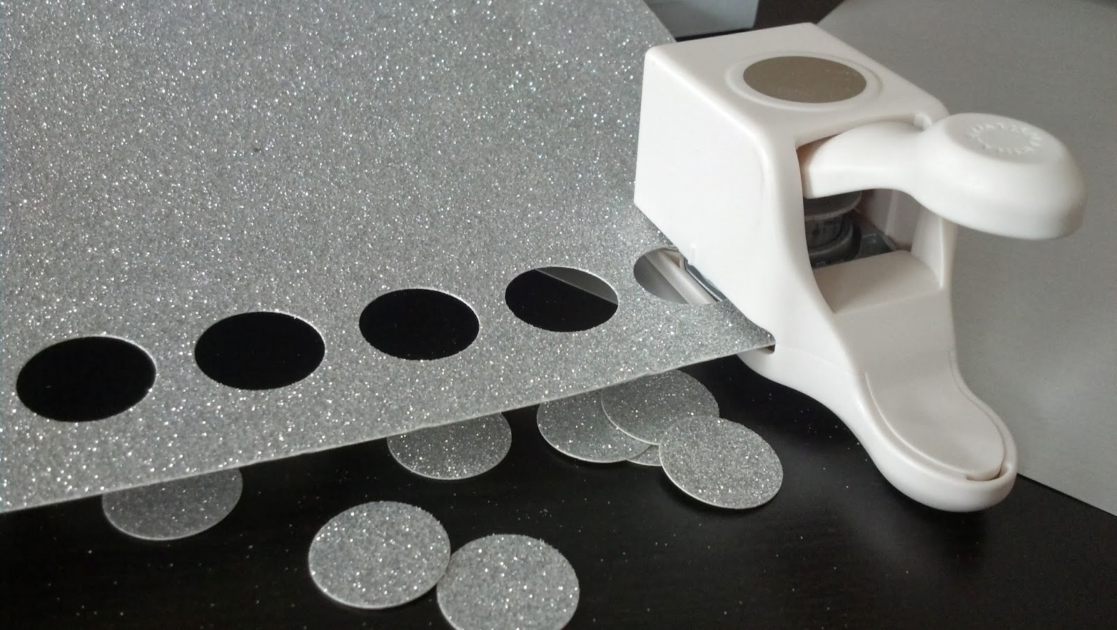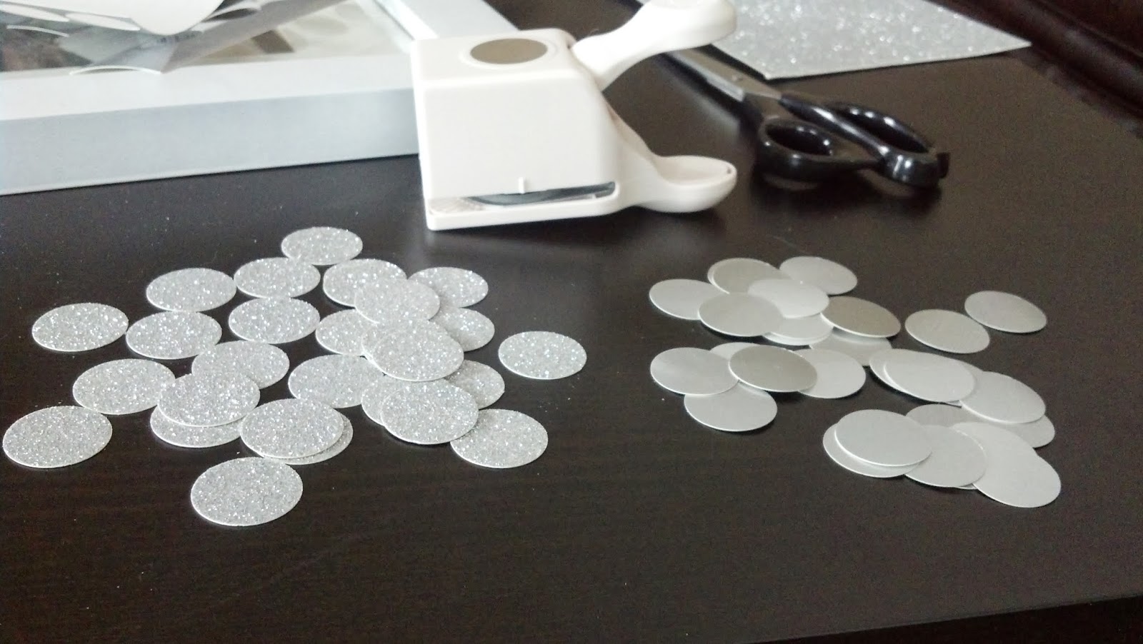 - Take your hole punch and punch those circles out of your scrapbook paper until you have about 15 polka dots of each color. I actually punched out almost double that amount and then realized I didn't need quite that many.