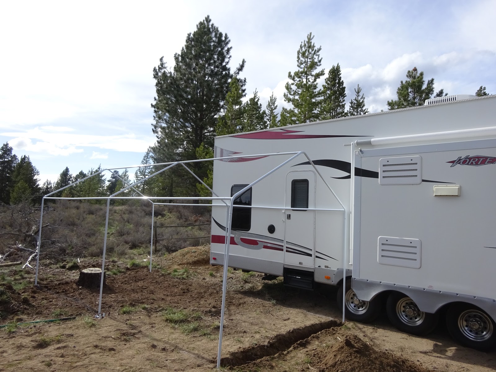 - Jesse started constructing the dog run for Hannah and dug down to allow the posts to stay in place. It will essentially block the toy hauler side door but we'll be installing a doggie door so Hannah can come in and out as she pleases during the day.