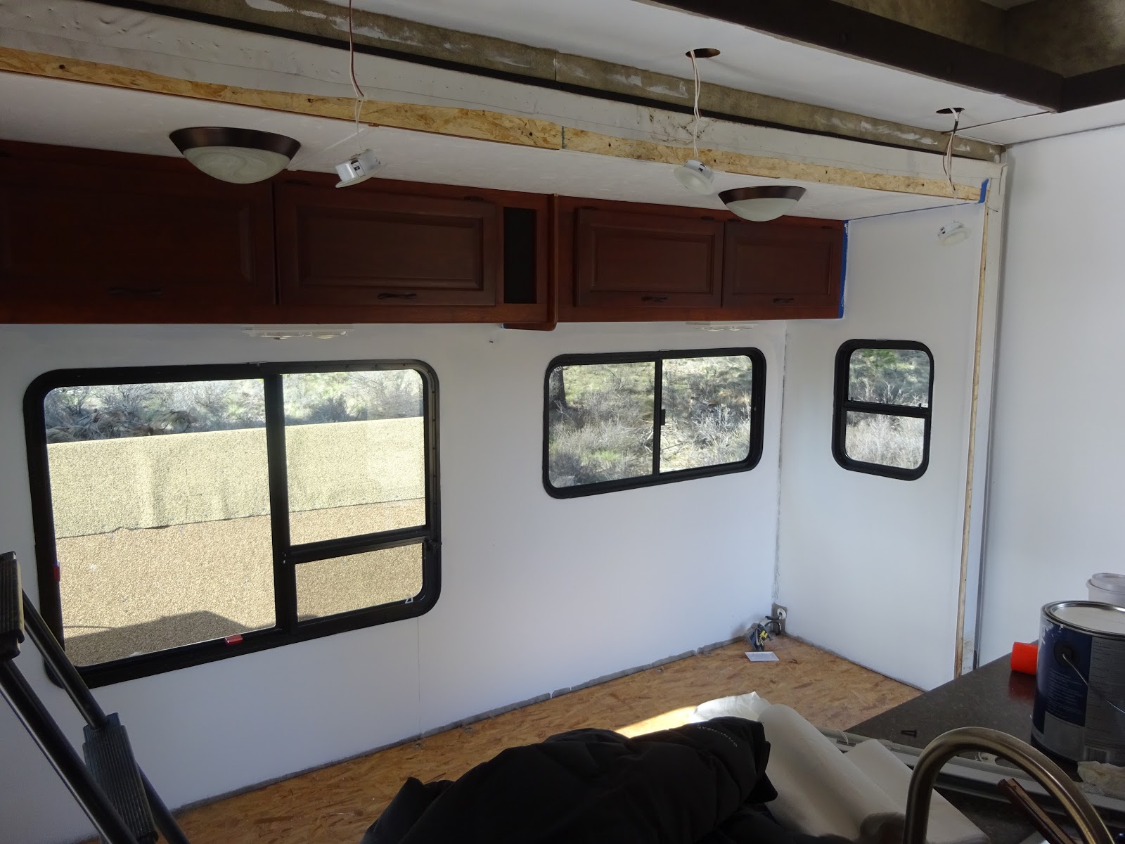 - We started painting the bedroom and living/kitchen space. We still have the toy hauler, the bathroom, the loft, storage area, and part of the kitchen to complete.