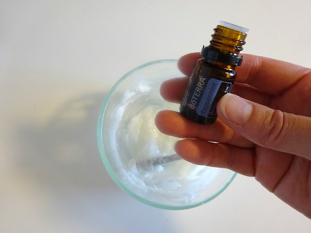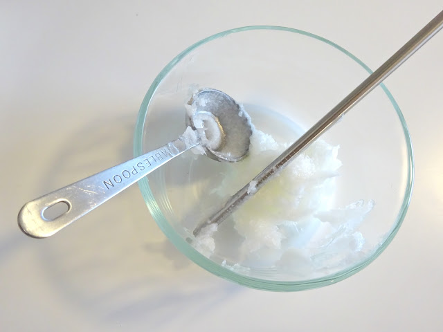 Measure your coconut oil and baking soda, then mix together in a glass dish. I didn't need to warm up the coconut oil because our apartment was about eighty degrees when I made the first batch so it was already melting. If you decide to use essential oils, add them to the bowl. Mix all together. As the coconut oil cools, it will harden and a paste will begin to form.