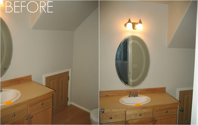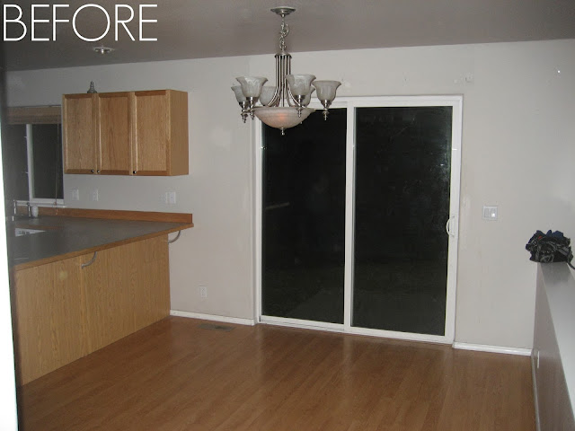 We are planning on replacing the flooring on the entire first floor with hardwoods and updating the kitchen with new appliances, new backsplash, and possibly updating the countertops before we sell in the near future. We'd also like to replace the floor, window, and door moulding throughout the house, repaint the interior and exterior of the house, replace the blinds, and install window casings in every window. Phew! For now, here are the before and current afters (before the final changes).